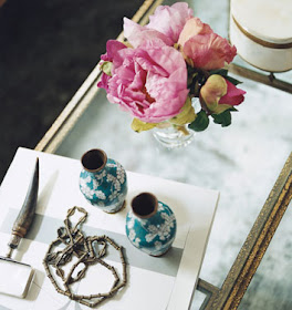 Georgia and her fiance painted the back wall of the bedroom a dark gray/blue to create a headboard effect until they could find a bed they liked. This is a great idea for small apartments that might have room for a headboard. The color also sets of the series of works by Duane Michals. The bedside tables are vintage English telephone tables that Georgia lacquered herself in slate color and sitting on them are old lamps from CB2. I think the pièce de résistance is the fabulous bedding from Olatz the fabulous shop owned by Julian Schnabel's wife.I think Georgia's home is not only a great reflection of her style but great way to live these days. There is that wonderful mix of family antiques, vintage furniture, pieces picked up traveling, things that were painted or repurposed, and new items from big retailers that creates a uniquely personal home. But then again, I didn't expect anything less from the chic and gracious Georgia Tapert!