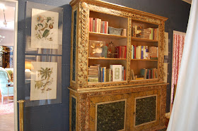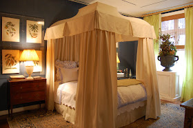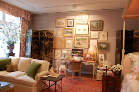 When I visted the show house, the weather was grey and ready to rain and the light from large windows made the room feel as though it could have been in Paris. Considering what a Francophile Ms. Moss is, it seemed especially fitting. The color palette for her room is French blue, mauve, ivory, pale pink and celedon and even though there are a lot of colors, the room is quite soothing. "Drama is created with contrast - in the case of these rooms, a light blue is used in the sitting room and a dark blue in the bedroom. The depth of color suits the room's use - dark for sleeping, light for reading, relaxing and conversation."