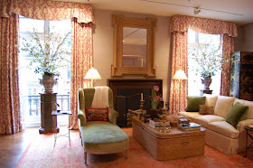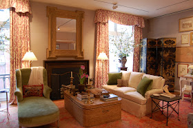 I love the wicker coffee table and bamboo window shades that "add texture, a dash of informality, and create that essential contrast with the silk curtains." The Decorating Notes from the press packet have the best quotes!